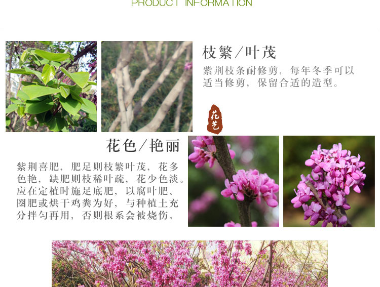 叢生紫荊先花后葉,花形如蝶,滿樹皆紅,艷麗可愛,葉片心形,多叢植于草坪邊緣和建筑物旁,園路角隅或樹林邊緣。因開花時,葉尚未發出,故宜與常綠之松柏配植為前景或植于淺色的物體前面,如白粉墻之前或巖石旁。