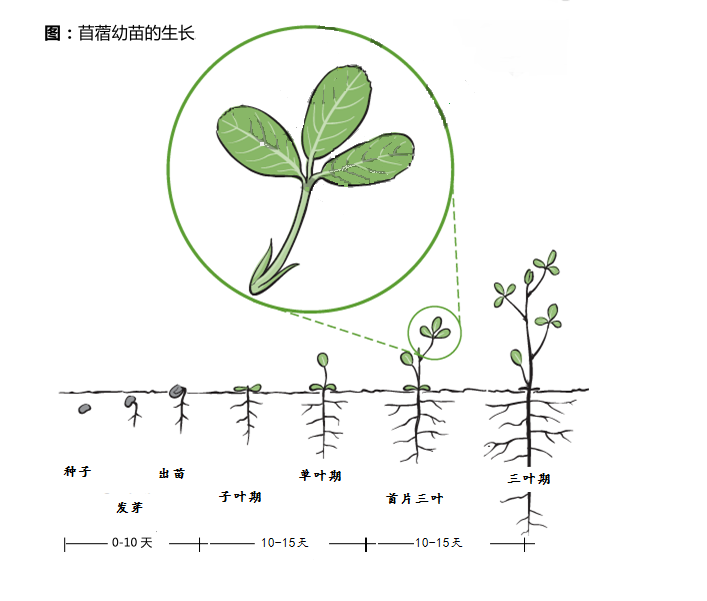 從上圖可以清楚的看到,苜蓿生長到三葉期之前,都是靠在“地下世界”的生活能力所決定的。也就是說,在這之前苜蓿能否發育正常,健康生長,不僅僅要靠她本身種子的抗逆的遺傳性,更大的取決于地下根部周邊環境的好與壞。 因為在三葉期之前,苜蓿的光合作用是及其微弱的。95%以上的能量或者生存的能力,要靠種子本身對地下環境的適應。這個期間需要的時間是30-40天。