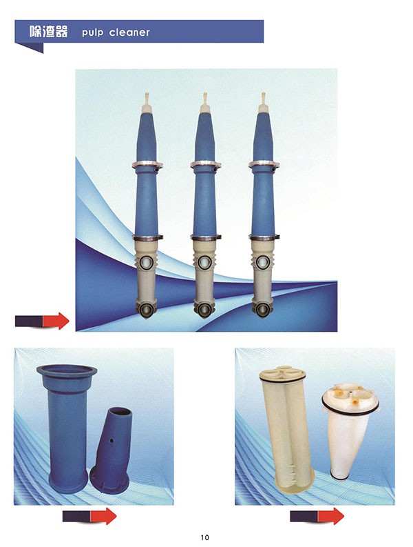 造紙工業(yè)中的一種紙漿凈化除渣設(shè)備。外形是約8~13度圓錐角的圓錐體,由不銹鋼、硬橡膠或內(nèi)襯聚乙烯基塑料層的鑄鐵等材料制成。內(nèi)壁平滑光潔,耐磨、耐壓、耐腐蝕,在40~60℃的溫度下不變形。利用渦旋運(yùn)動除去較重的雜質(zhì)。除渣效率較渦流除渣器高,能顯著降低紙漿的塵埃度。且可成束或成排并聯(lián),尾渣可分段再選,減少紙漿除渣的損失。
