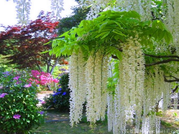 紫藤,樹體高0.6~2米高之間,樹葉形狀按照品種不同有差別,有些細長,有些比較圓,紫藤花色彩是充實,如紅色,紅色,淡黃色,白色等,開花時間很長,開花量大,每年的是開花的時間時候從6月下旬到8月下旬,花種9~10月才熟,有較好的發芽水平。