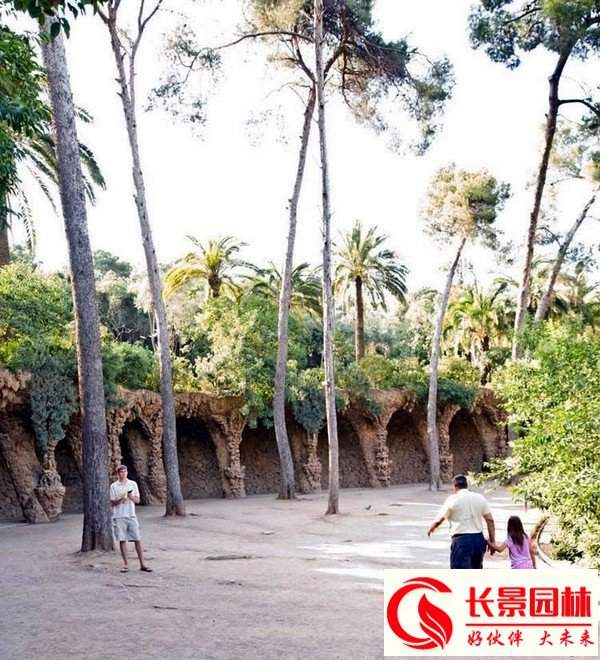這里有堪稱是世界第一長(zhǎng)度的座椅。長(zhǎng)椅用石砌成,形似波浪蜿蜒曲折。表面用馬賽克碎片隨意拼貼,圖形各異且隱含寓意。長(zhǎng)椅根據(jù)人體力學(xué)設(shè)計(jì),靠