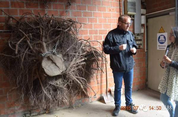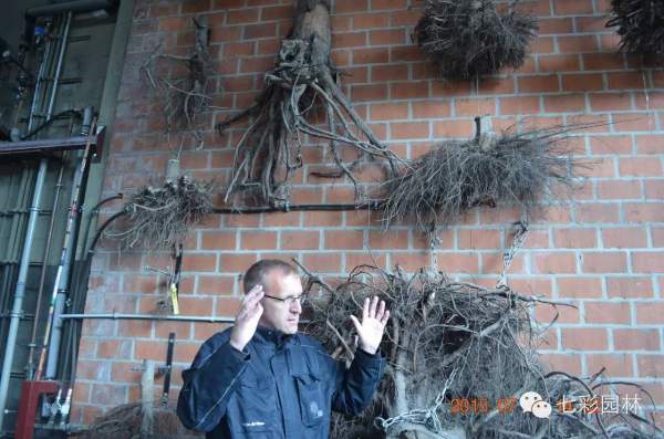 參觀團全程由泰樂先生陪同講解,是負責銷售比利時、荷蘭市場的經(jīng)理,學習森林植物學專業(yè)后一直在苗木產(chǎn)業(yè)工作,和之前參觀最大的不同點就是懸掛在墻上的根系,并詳細講解根系健康的重要性,具有健康旺盛的根系才是合格的商品苗木。