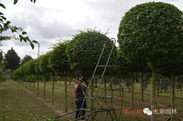 樹木培育全部中央樹桿型管理,很注意枝干比,側枝粗度不能超過主干粗度的30%,大樹為增加分支點高度,直徑10公分的側枝鋸掉三年就可愈合成現(xiàn)在的狀態(tài)。施工也沒有對樹木的分支點要求太多,可以任意修剪高度。