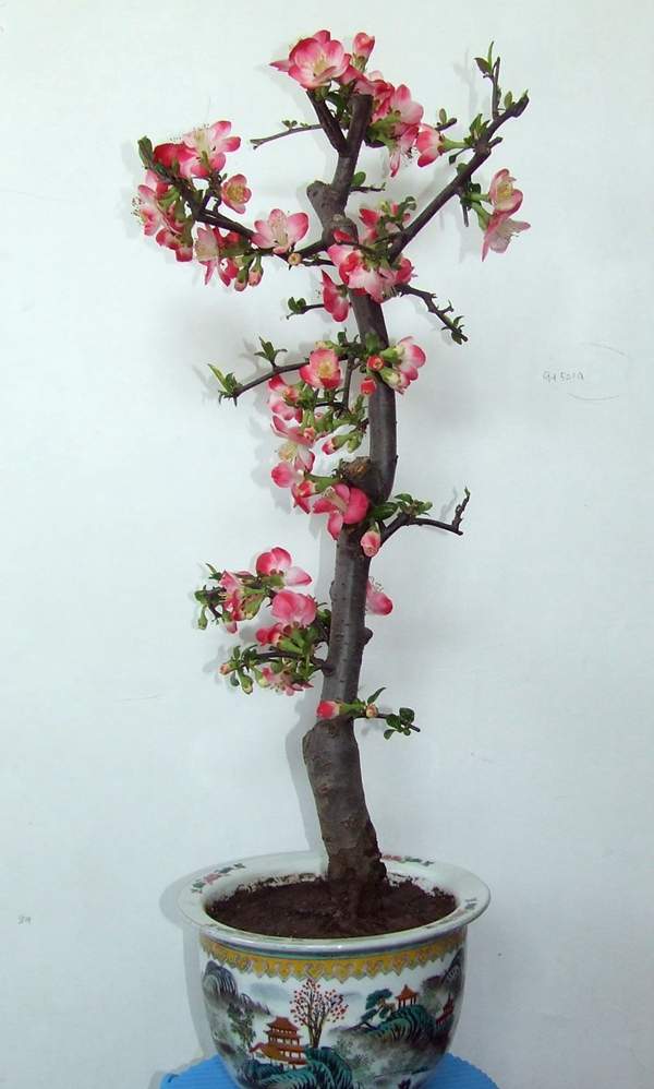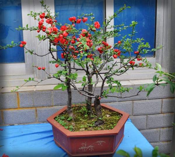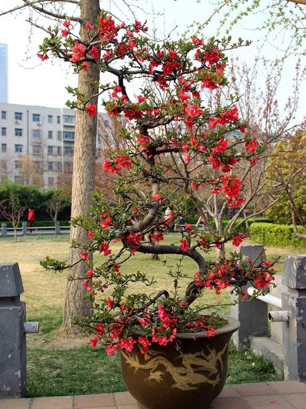 貼梗海棠它又叫作皺皮木瓜,而且還有許多的叫法,是落葉灌木的一種,它在園林綠化上屬于觀花、觀果的優(yōu)良品種;特別是在花期的時(shí)候,滿樹花朵非常的艷麗,顏色多樣;貼梗海棠不但在園林效應(yīng)上有它的風(fēng)采,而且它的果實(shí)還可以吃,果實(shí)營養(yǎng)豐富含維生素多,在醫(yī)學(xué)上也有它的獨(dú)特功效;貼梗海棠在綠化上可以栽種在景區(qū)、道路兩邊、庭院等地方;還可以在一些綠化樹中栽種一兩棵貼梗海棠,可以起到點(diǎn)綴的效果,成片的栽種也有不一樣的觀賞效果;它不僅可以地栽也可以制作為盆景,造型多種,常被放置在客廳、花臺(tái)、陽臺(tái)、門庭邊都可以,下面我們就來欣賞一下它的各種造型盆景吧: