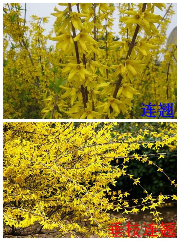 垂枝連翹:垂枝連翹是連翹的變種,跟連翹非常的相似,,一般的連翹枝條生長(zhǎng)的都比較直立,只不過(guò)枝條比較柔軟纖細(xì)呈下垂?fàn)顟B(tài),它的花期在3-5月,果期在7-9月。