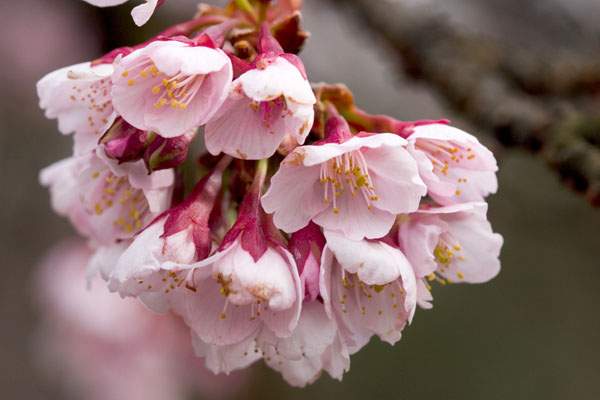 寒櫻(かんざくら)1月中旬開(kāi)花。寒緋櫻和山櫻的雜交品種。