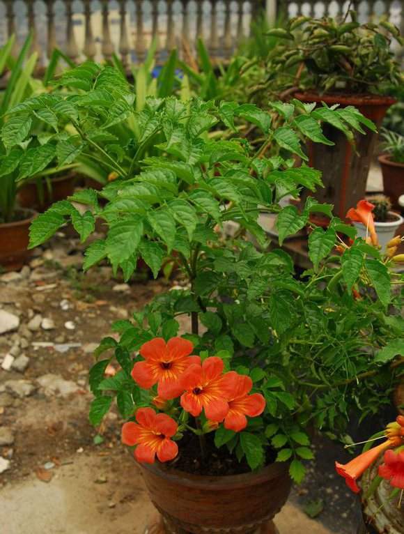 因為凌霄花很皮實,用其枝干扦插上盆就可成活,培育成觀花盆景,別有風味。所以盆栽的重點不在于如何養活它,而在于如何養好它,下面有幾點凌霄花盆栽的日常養護要點,供花友參考。